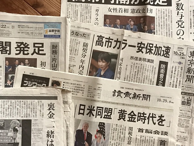 公明党が自民党との連立を解消し、少数与党に陥った高市自民党は連立相手を巡るすったもんだの末、自民・維新連立政権として動き出した。そしてトランプを交えての高市劇場がやっと終わった。10月21日に首相に就任、空疎さにヘキヘキさせられた10日間だった。戦後80年にして日本に登場した極右政権である高市自民党はいったいどのような政治をやろうとしているのか。さまざまな動きをつなぎあわせながら分析する。簡潔にいえば、社会・経済全般にわたる戦時体制化、弱者いじめ、多様性の封殺と表現の自由の制限といったキーワードが浮かび上がってくる。(大野和興)