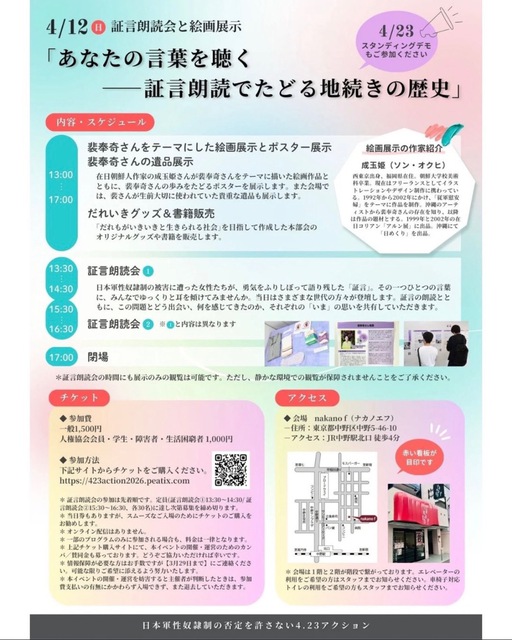 ¡Ú¾Ú¸ÀϯÆÉ²ñ¡¦³¨²èŸ¼¨¡Û ¡Ö¤¢¤Ê¤¿¤Î¸ÀÍÕ¤òݤ¯ ¡½ ¾Ú¸ÀϯÆÉ¤Ç¤¿¤É¤ëÈï³²¼Ô¤ÎÎò»Ë¡× ¢þÆü»þ¡§2026ǯ4·î12Æü¡ÊÆü¡Ë13:30~17:00¡Ê³«¾ì13:00¡Ë ¢þ²ñ¾ì¡§nakano f¡ÊÅìµþÅÔÃæÌî¶èÃæÌî5-46-10¡Ë ¢þ»²²ÃÈñ¡°ìÈÌ¡§1500±ß¡¡¢³ØÀ¸¡¦²ñ°÷¡¦¾ã³²¼Ô¡¦À¸³èº¤µç¼Ô¡§1000±ß
