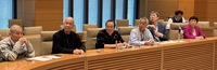 記者会見の様子(左から)森俊英さん、西谷徳道さん、上田慶司さん、具志堅隆松さん、金英丸さん、福島瑞穂参議院議員